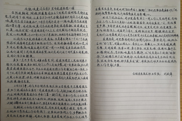 “以前總認(rèn)為英雄離我們很遙遠(yuǎn),當(dāng)屏幕中彈出一個(gè)又一個(gè)在新型冠狀病毒肺炎疫情中犧牲的同志,深深地觸動(dòng)著我的心靈。因?yàn)橛袩o(wú)數(shù)像施詠康這樣在戰(zhàn)疫一線一心為國(guó),舍身忘死的同志,讓我們看到了戰(zhàn)勝疫情的希望。他們是我們這個(gè)時(shí)代真正的英雄,是我們學(xué)習(xí)的楷模。”臨時(shí)黨支部黨員劉莉萍在學(xué)習(xí)心得中這樣寫道。