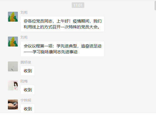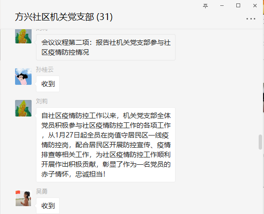 3月13日,受疫情影響,方興社區機關黨支部通過微信群的線上形式召開了一次特殊的黨員大會,全體黨員準時到場打卡簽到。