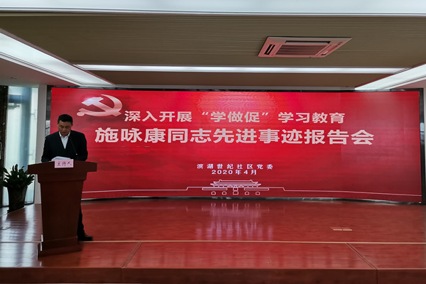 此次會議由社區黨委副書記鐘震年同志主持,社區黨委委員、紀委書記汪偉紅同志傳達了包河區委和區委宣傳部關于深入開展“學做促”學習教育的相關文件精神,社區黨委委員謝輝同志作了施詠康同志先進事跡報告。
