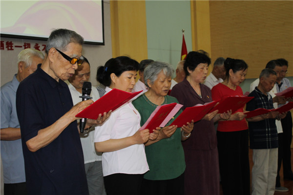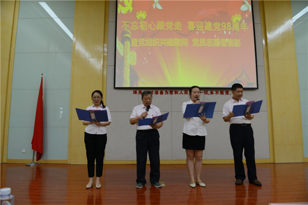 堅守“初心”,重溫入黨誓詞。活動開始之際,全體黨員起立,奏國歌、重溫入黨誓詞。在鮮紅的黨旗下,黨員佩戴黨徽,舉起右手、握緊拳頭,莊嚴宣誓,重溫入黨宣誓時的莊嚴承諾和堅定決心,牢記共產黨員的政治責任和歷史使命,永葆共產黨員的政治本色。