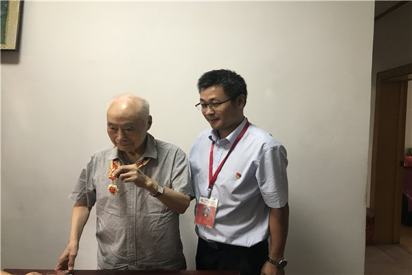 9月27日下午,社區小小志愿者手提蛋糕,開心地來到了轄區新四軍陳發祥老人的家中,聆聽老人的抗戰故事以及祖國的歷史。1928年出生的陳發祥老人,生來家境還算不錯,熱愛文學,奈何戰火紛飛,只能棄筆從戎。九一八事變后,陳老的父親便加入了中國共產黨,隨后陳老也加入抗日大軍中,成為一名新四軍,家人全部參軍,兄長還在淮海戰役中犧牲,即便如此,陳老依然不曾后悔參軍。聽完陳老的英勇事跡,小小志愿者激動地說道:“以后我也要像爺爺一樣當軍人,打壞人!要好好學習,報效祖國!”活動結束后,寧國新村社區黨委書記給老人戴上了彰顯榮譽的70周年紀念徽章。老人開心地說道:“這是我的榮譽,我一定要好好收藏!”
