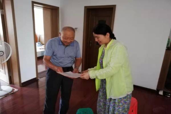 “陳老,您好!今天我們代表村黨委開展‘紅色家訪’,給您送一份‘紅色家書’。另外,馬上就是八一建軍節了,我們也向你們這些退役軍人進行慰問,感謝你們當年為國家國防事業所作的貢獻!”