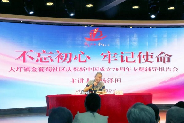 9月26日,大圩鎮金葡萄社區黨總支開展“不忘初心 牢記使命”專題輔導報告會,此次報告會特邀中宣部基層理論宣講先進個人楊澤田主講,金葡萄社區黨總支全體工作人員、社區樓棟黨小組組長代表、樓棟長代表等居民骨干共計110余人參會學習。