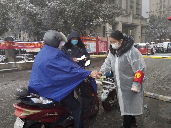 大雪中,石橋社區(qū)婦聯(lián)主席張麗堅(jiān)守崗位,為進(jìn)入小區(qū)居民測(cè)量體溫
