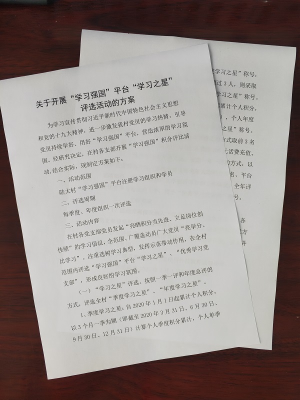 陸大村黨總支利用“學(xué)習(xí)強(qiáng)國”平臺開啟促學(xué)新模式,動員黨員、群眾“亮學(xué)分、比學(xué)習(xí)”,形成良好學(xué)習(xí)氛圍,推動學(xué)習(xí)型黨組織建設(shè)。在疫情防控期間,將“學(xué)習(xí)強(qiáng)國”平臺搭建成各支部疫情防控,凝聚人心的重要陣地。