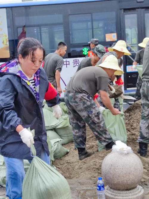 7月24日,新一輪降雨來臨,官兵們冒雨抗洪。巾幗不讓須眉,鄭伏工作站李薇被軍人的精神所感動,自覺加入到他們的隊伍中幫忙裝填和運送沙包。