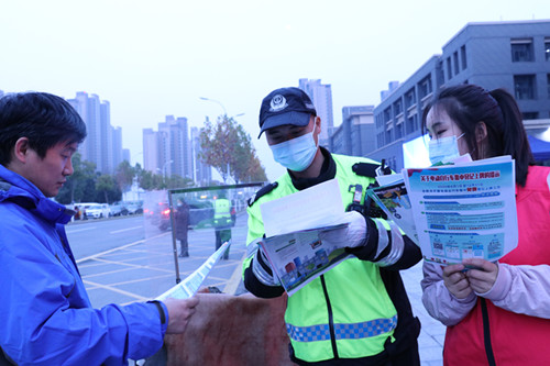 社區迎淮黨員先鋒志愿者聯合交警在合肥四中門前擺起宣傳臺,向家長和學生發放交通安全宣傳單頁,宣傳安全出行注意事項;針對電動自行車車主,志愿者們重點宣傳上牌登記政策和流程,切實增強居民安全出行觀念。