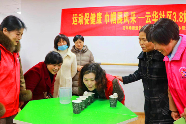 趣味活動,巾幗展風采。伴著詩意朗讀社成員的贊美女性詩歌朗誦,云華社區三八婦女節趣味運動拉開了帷幕。“水上吹乒乓球”、“雙人運氣球”、“定點拍球”等運動項目激情上演。短暫的比賽,大家充分釋放激情,臉上洋溢著燦爛的笑容,共同享受運動帶來的快樂,為生活增添一絲樂趣,展示了女性良好精神風貌的同時,也讓她們在健康的運動中體味著團結合作的快樂、生活的美好。