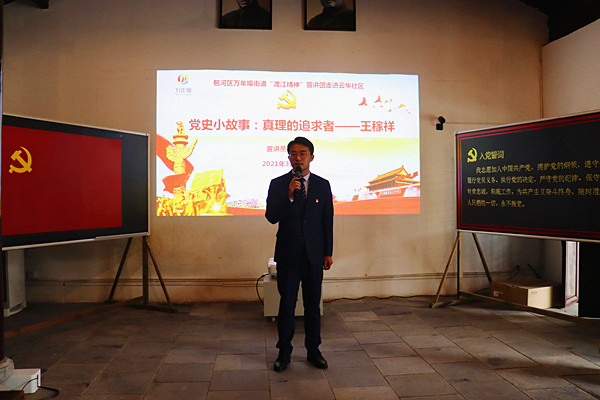 二是黨史學習教育與紅色愛國教育結合。依托轄區渡江戰役紀念館、安徽名人館紅色教育資源,對社區黨員、駐地單位黨員、社區青少年進行黨史教育,開展“傳承紅色基因凝聚奮進力量”黨史學習教育主題活動、“學黨史故事 傳承紅色基因”《真理的追求者——王稼祥》渡江精神進社區紅色宣講活動、“紅聲萬年”青少年志愿宣講隊清明節“傳頌紅色經典 爭做時代新人”緬懷革命先烈主題活動等。通過參觀紅色場館,宣講紅色故事,重溫入黨誓詞,進一步激發愛國熱情。