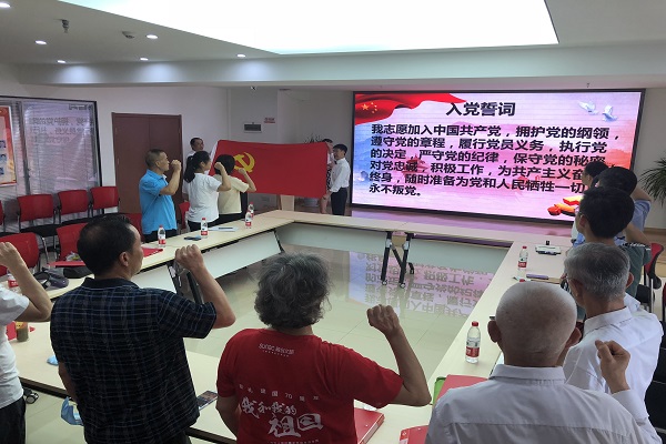 活動中,老兵閔克泉用《一位老兵的成長歷程》生動描述了與黨共成長的青蔥歲月。在一支打不爛,拖不垮的頑強(qiáng)集體中,他見證著黨的發(fā)展由星星之火變成燎原之勢。緊接著,在場黨員全體起立,右拳高擎,神情莊重,面對鮮紅的黨旗鄭重宣誓。抒發(fā)對黨和人民的忠誠,嘹亮的誓言回蕩在會議室,也深埋在每一位黨員的心中。最后,由映山紅詩文朗讀社全體人員共同朗誦《有一首歌》,其中寫到:“有一首歌,在脈管里流淌,在心里頭銘刻;這首歌的名字叫做——沒有共產(chǎn)黨就沒有新中國”,氣勢磅礴,將整場盛宴推向高潮。