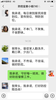 疫情就是命令,防控就是責(zé)任。疫情防控阻擊戰(zhàn)打響后,五里廟社區(qū)紀(jì)委深入學(xué)習(xí)貫徹習(xí)近平總書記重要指示批示精神,把做好疫情防控監(jiān)督工作作為當(dāng)前重要任務(wù)。“我們這個微信群一開始只有幾個人,主要是我們負(fù)責(zé)人互相交流信息,后來進群的人多了,我們就想嘗試發(fā)動線上監(jiān)督,沒想到效果不錯,還有黨員和網(wǎng)格員主動請纓,我們就推出了一個“線上承諾”,讓大家都參與到疫情防控中來。”社區(qū)紀(jì)委書記周濤說。