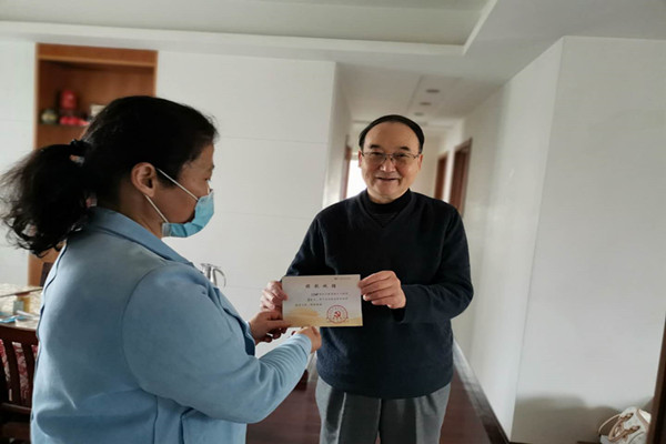 4月14日一大早,同安街道分路口社區各支部書記來到黨員家中,將中組部發放的愛心捐款收據送到每位黨員手中,并對他們為此次疫情防控工作捐獻的愛心捐款表示感謝。