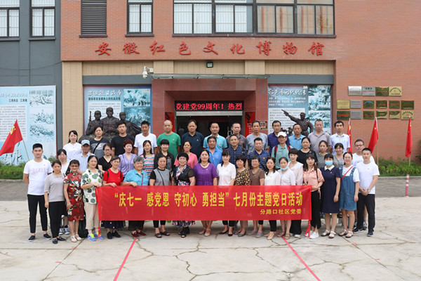 為熱烈慶祝中國共產黨成立99周年,教育引導廣大黨員干部學習革命先烈精神,做到知史愛黨、知史愛國。近日,分路口社區黨委在安徽紅色文化博物館開展“慶七一 感黨恩 守初心 勇擔當”七月份主題黨日活動。社區各支部書記、支部委員、在職黨員及元一柏莊紅色領航和美小區建設的黨小組長和黨員身份的單元長參與此次活動。