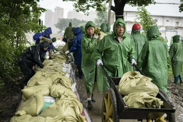 7月19日上午,在南淝河右岸胡淺泵站附近大堤上,數百名防汛工作人員正在裝卸砂石料、打包沙袋、壘筑堤壩。