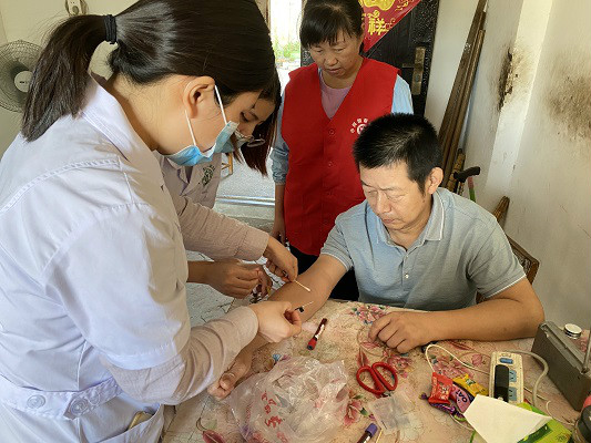 原來,郭永慧老人的兒子胡玉琳在6號夜間突發不明原因的腳踝紅腫,并且疼痛難忍,在床上翻來覆去無法入睡。郭永慧老人被兒子的呼喊聲驚醒后,用了按摩、熱敷、貼止痛藥膏等方法都不見好轉。忙活了大半夜,天空已漸明,而胡玉琳依舊不住喊疼。情急之下,老人撥通了社區志愿者的號碼,消息在五里廟社區志愿者群內迅速得到響應,黨員志愿者王世珍立刻開著自己的私家車前往社區衛生服務站,把醫生送到郭永慧老人家,為胡玉琳檢查發病原因,隨后,五里廟社區“小阿嫂幫幫團”志愿者也趕到郭永慧老人家中,為她安撫情緒。
