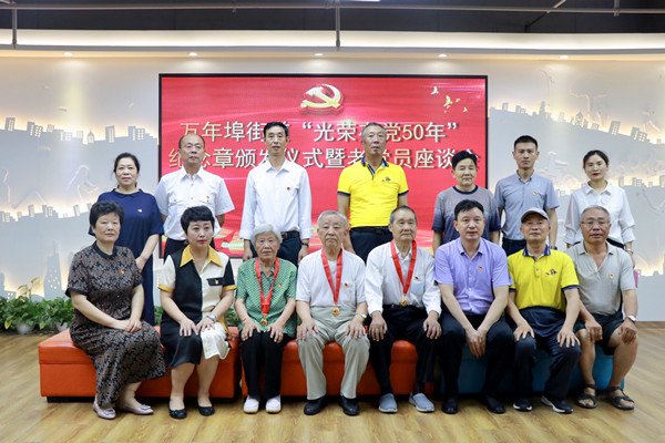 活動現場,萬年埠街道還舉行“光榮在黨50年”紀念章頒發儀式,現場宣讀“光榮在黨50年”紀念章獲得者名單,萬年埠街道黨工委書記許春雨為到場的沈桂英、劉賢權、楊仁照3名老黨員代表頒發紀念章。