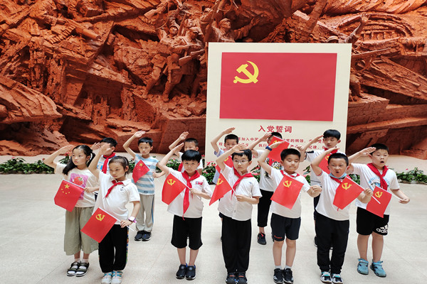 下午4時,參加活動的少年們來到渡江戰役紀念館內,面對宏偉的英雄雕塑,大家整齊著裝、莊嚴肅穆,佩戴紅領巾,齊聲高歌《我們是共產主義接班人》,向偉大的中國共產黨獻上我們最誠摯的祝福。