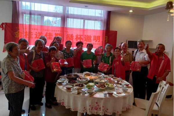 早上7點多,服務(wù)隊的黨員志愿者們早就忙得熱火朝天,布置場地,準(zhǔn)備食材,陪老人們聊天。不一會兒,餐桌上就擺滿了品種豐富的飯菜,一時之間,整個會議室里香氣四溢,社區(qū)還精心準(zhǔn)備了象征著團(tuán)圓的月餅、酸奶等點心。大家紛紛談?wù)摦?dāng)下美好幸福的生活,感嘆著如今發(fā)展變化之快,充滿歡聲笑語。