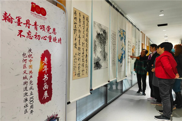 近百余幅書法、繪畫作品吸引眾多居民前來觀展。社區黨員、書法愛好者用筆墨丹青謳歌黨的豐功偉績、展現祖國的大好河山,表達了對國家繁榮昌盛的美好祝愿。