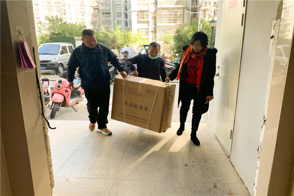徐文芳,69歲,無生活自理能力。家里只有她和老伴陳廷玉一起生活,家庭經濟困難,因此享受低保和重殘護理補貼。大陳工作站黨支部為了解決徐文芳行動不便的生活難題,主動向區殘聯申領一個輪椅。黨員志愿者親自將輪椅送到徐文芳家中,并且現場組裝調試。