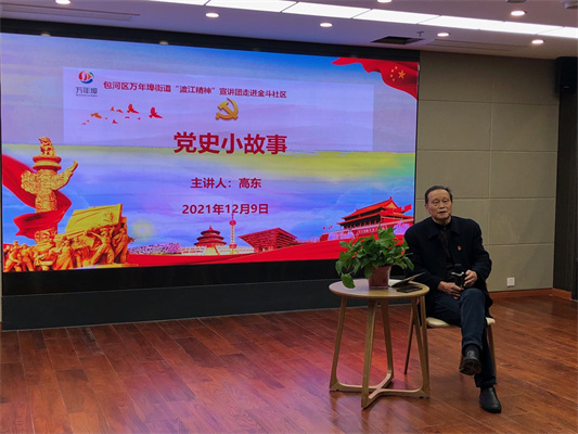 賡續紅色血脈,重溫黨史守初心。12月9日下午,金斗社區黨委邀請包河區萬年埠街道“渡江精神”宣講團成員高東同志開展黨史學習教育宣講活動。會上高東同志以黨史故事的形式,深入淺出地向大家講述了中國共產黨各個歷史的重大事件、重要會議、重要人物,著重剖析了井岡山精神、遵義會議精神、延安精神,深刻闡述了我們黨從小小紅船到巍巍巨輪的百年奮斗歷程。“不怕艱苦不怕犧牲,我們黨憑借這種精神帶領我們走向勝利。”已年過7旬的高老慷慨激昂地描述著。金斗社區黨委書記王相全表示,黨史學習教育是基層黨建的核心教育,需要時刻學習黨的故事、黨的光榮傳統和優良作風。此次宣講使轄區居民了解到共產黨人百年不變的初心與奮進的偉大精神,引導群眾主動了解黨的光輝歷史、體會黨的精神譜系、傳承黨的紅色基因。