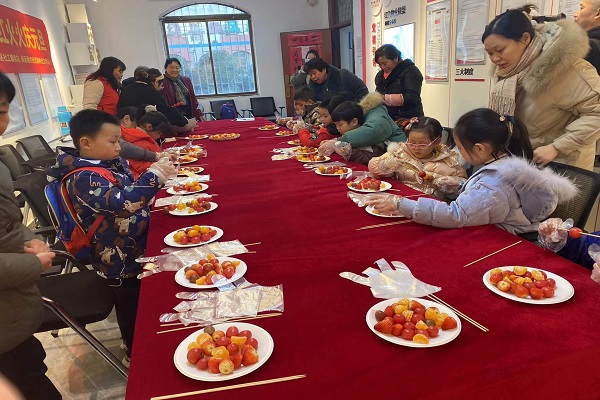 黨員志愿者張老師為大家講解了冰糖葫蘆的起源和制作步驟,然后帶著大家動手制作糖葫蘆。制作過程中,大家互相幫助、“各顯神通”,利用不同組合方式用竹簽將山楂和葡萄、草莓和桔子等水果串起來,做出了一串串別具特色的糖葫蘆。最后,黨員志愿者給孩子們串好的果子澆上了糖汁。紅彤彤的山楂包裹著糖膜,咬上一口,嘎嘣脆,酸中帶甜,唇齒留香。“冰糖葫蘆酸酸甜甜真好吃,原來這是新年的味道”,孩子們開心地說道。