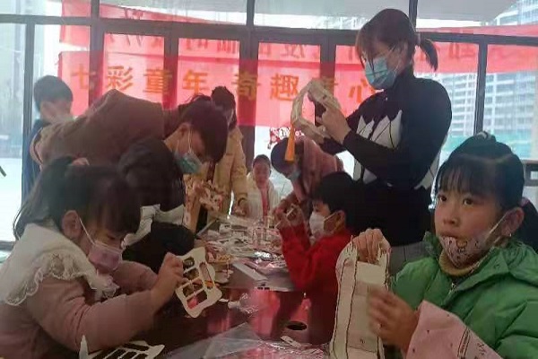 活動現場,社區志愿者們變身為特色“課堂輔導員”向孩子們講解了迎新年的習俗,激發大家對傳統文化的熱愛。隨后社工和志愿者把制作燈籠的材料發到每位小朋友的手中,并向孩子們示范和詳細講解了燈籠的制作步驟。拿到燈籠材料包后,小朋友們個個都興致高昂,立刻就動手做了起來,大家分工明確有條不紊的進行著虎燈的制作,由家長們幫助孩子剪下虎燈的精美圖案,小朋友們負責把框架和制片、燈籠桿、繩子、燈線等粘合組裝起來,現場一片歡聲笑語。