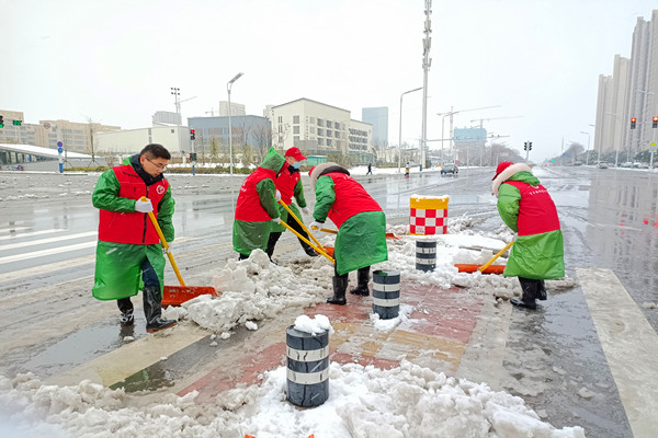 小區涌現志愿紅,清掃除雪保出行。雪情就是命令,2月7日一大早,萬年埠街道云華社區黨委第一時間在睦鄰群、黨員群發出招募信息,發動黨員、居民志愿者、安達巡邏隊等,自發組成40余人的鏟冰除雪突擊隊,集中清理居民小區出入口、行人進出的主干道沿線積雪。志愿者們紛紛使用鐵鍬、掃帚等工具將厚厚的積雪清理干凈,忙碌的紅色身影構成了雪中的一道靚麗風景線,讓過往居民尤為感動。經過三個小時共同的努力,雪白的畫卷上畫出了一道道整齊寬闊的“線條”,極大地消除安全隱患,有效保障居民出行安全。