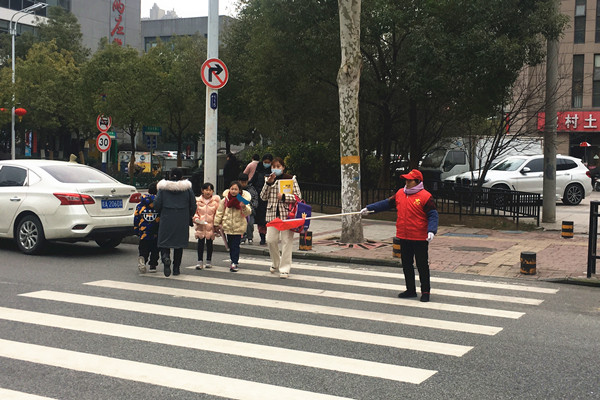 隨著放學鈴聲響起,早早就等待在馬路兩側的志愿者立即打起十二分的精神,等待著孩子們放學走出校門。他們身穿紅馬甲、手持慢行小紅旗,全心守護著孩子們的人身安全。他們緊盯過往車輛,時而挺身上前以紅旗示意急駛車輛停下,讓家長和孩子們盡快通過馬路,時而攔下奔跑的孩子,讓極速通過的車輛駛離,他們在以身軀守護著孩子們安全回家。