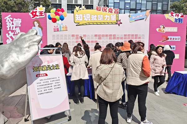 知識競答環節,題目涵蓋傳統文化、百年黨史、婦女權益、生活常識等相關知識,女職工通過觀看展板、相互交流、知識競答等方式學習掌握婦女維權的方法,更加堅定緊跟黨的腳步的信念。與此同時,趣味游戲區的活動也在同步進行,形式多樣的趣味游戲精彩紛呈,使整個活動現場掌聲、笑聲連綿不斷,一次次把氣氛推向高潮。女職工們在“女子力加油站”紛紛寫下祝福或對未來的展望貼在祝福墻上,為自己和家人、朋友加油打氣,許下對美好生活的期許。