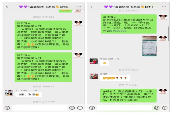 富金商圈黨委利用樓宇微信群,積極推送年輕人愛看想看的疫情防控主題內容,線上傳播抗“疫”正能量。事實經驗告訴我們,防控疫情最科學、最經濟、最有效的方法就是接種疫苗,接種新冠疫苗是減少感染、重癥和死亡的根本之策。為鞏固新冠肺炎疫情防控成果、提高疫苗接種便利性,社區黨委克服實際困難,陸續在轄區省地質測繪院小區、金保中心、富廣大廈設置“加強針”臨時接種點,目前已接種近五百人次,進一步提升居民們免疫屏障水平。富金商圈黨委吹哨,樓宇內國家林草局機關黨總支黨員志愿者們迅速報到,在每天上班早高峰時段參與樓宇疫情防控值守,嚴防安康碼、行程碼不符合要求的人員進入樓宇場所,齊心協力共筑防疫堅固防線。安徽大富地產集團有限公司黨支部廣泛動員公司黨員亮身份、當先鋒、做表率,全力做好商務樓宇的防疫任務。