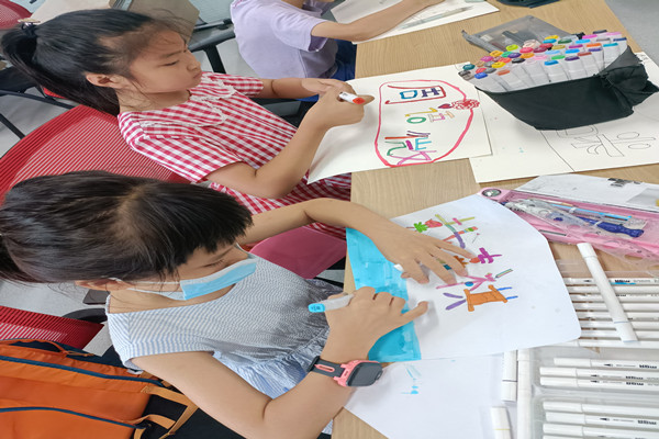 在創意繪畫課堂的第一節課上,小老師帶領小學員們給自己的名字設計專屬的藝術字簽名,小學員們緊跟老師節奏,在畫紙上對自己的名字進行自由發揮,再進行圖案裝飾和顏色填充,使畫面更加完整和有沖擊力,每位小學員都充分發揮想象拿起畫筆,最終都設計出來了自己滿意的藝術字簽名作品。
