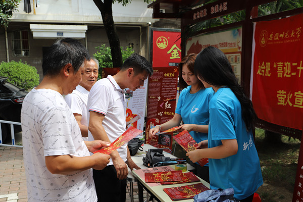 活動前期,安徽師范大學“螢火宣講團”在望湖北苑黨群服務站進行了細致的宣傳工作,設計了宣傳海報、宣傳冊,通過懸掛橫幅、向周邊社區居民發放宣傳冊的方式,讓更多人知曉宣講活動開展的時間、內容,引領黨員、居民群眾進一步了解黨史,推動社區黨史學習教育走深走實。