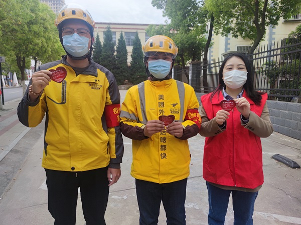 朱崗社區商業繁華、餐飲單位眾多,外賣小哥一頭聯系著商家,一頭聯系著千家萬戶,朱崗社區充分發揮組織優勢、動員優勢,利用他們走街串巷、進樓入戶的“移動探頭”的優勢,引導騎手積極參加疫情防控志愿服務,組建疫情防控流動宣傳志愿服務隊伍,讓他們充分發揮“走街串巷”的職業優勢,將疫情防控宣傳工作同取餐、送餐工作相結合。向點單居民宣傳疫情防控知識,讓廣大居民在品嘗美食的同時,提高群防群控的意識,為轄區筑牢流動疫情防控屏障貢獻新力量。