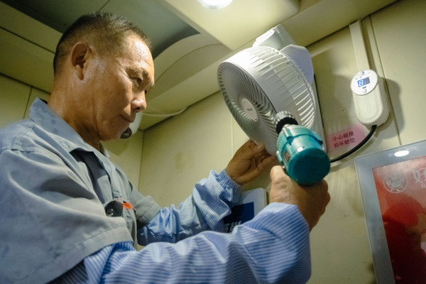 7月初開始,連續一個多禮拜的中午12點半,馮金海的身影都會準時出現在樓棟的電梯中,趁著中午時間段小區電梯使用率低,馮金海利用午休時間加班安裝電梯風扇,盡快緩解高溫天氣帶給居民的乘梯不適。作為維修人員,馮金海已經工作了11年,無論高溫嚴寒,他始終堅持崗位,耐心解決居民監控損壞、用電用水等問題。