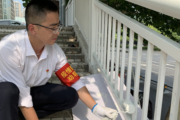穿上作業服,戴上手套,烈日下,拎著20多斤重的油漆桶來到人行道防撞欄旁,把長刷子蘸上油漆往欄桿上粉刷……為保持戶外設備干凈整潔,方圓薈車場安全主管丁健帶領著項目工人們在戶外粉刷人行道欄桿,頂著大太陽“火熱”作業。此時手機軟件顯示戶外溫度已達34度,而體感溫度則是42度。