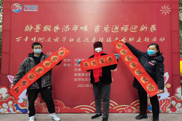 在新年即將來臨之際,為營造祥和、歡樂、喜慶的節(jié)日氛圍,2023年1月11日下午,萬年埠街道云華社區(qū)黨委聯(lián)合轄區(qū)相關單位,共同舉辦“翰墨飄香添年味 吉兔送福迎新春”活動,云華社區(qū)公益書法家們走進小區(qū),為廣大居民撰寫新春對聯(lián),送上新春祝福。