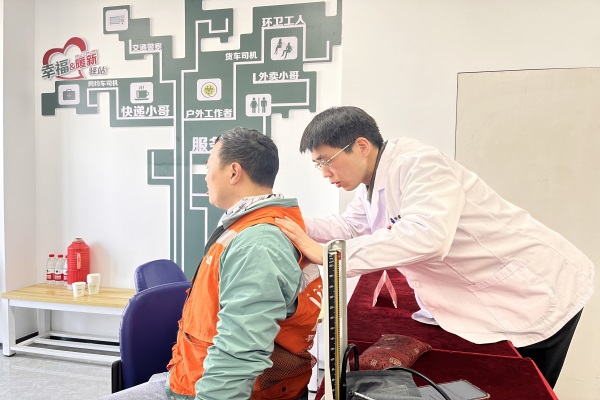 (圖為義診現場,醫生在為快遞小哥測量血壓)