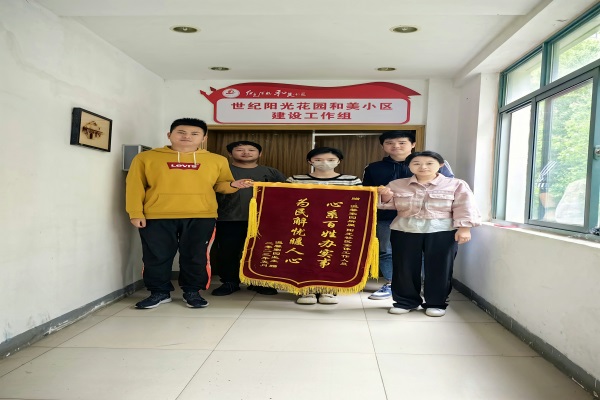 (居民為社區送上印有“心系百姓辦實事 為民解憂暖人心”的錦旗,對社區在物業矛盾糾紛化解中的幫助表示感謝。)