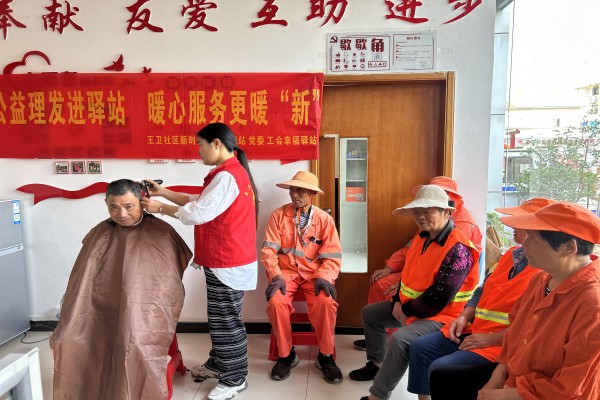 為進一步發揮黨建引領,為轄區戶外勞動者提供更加溫暖優質的服務,5月23日,王衛社區黨委、新時代文明實踐站、工會在驛站中開展愛心義剪服務,為“城市美容師”環衛工人們解決“頭”等大事,并為他們送上夏日禮包,感謝他們常年的辛勤付出。活動現場,理發師志愿者動作嫻熟、細致耐心地為環衛工人修剪出滿意的新發型,熱情周到的服務,贏得了大家的一致好評。大家看著自己的新發型,紛紛豎起大拇指,夸贊理發師手藝好,現場氣氛和諧融洽。